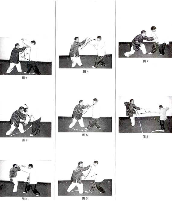 动作④甲右掌由上向下拍击乙击来的左掌;左脚由后向正前上一步,成右后三七步,左尖拳随右腿动向正前平钻击乙胸部。(图7)