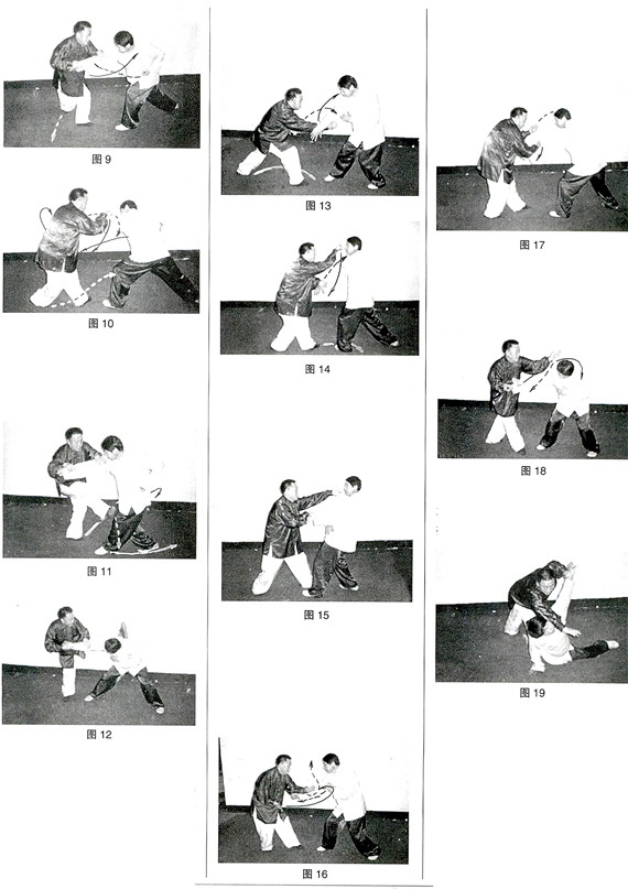 动作②乙右拳回撤,左拳向前攻甲腹部;左掌向右、向左上柔化乙右臂,右掌向左柔化乙击来左前臂。(图17)