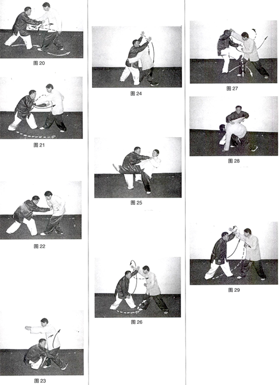 动作③甲右脚向下落步踏乙脚面,左脚向左后,上体向右转约90°;同时左手狠扭乙右臂,右掌狠按乙右肩上侧向下,将乙制服。(图28)