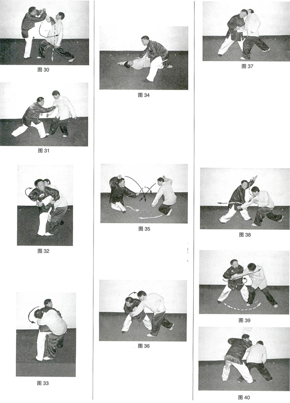 动作③甲上体向右转约180°,右脚随体动向左,左掌叼掳乙击来左拳,右肘猛击乙左肩上部。(图40)。