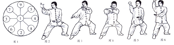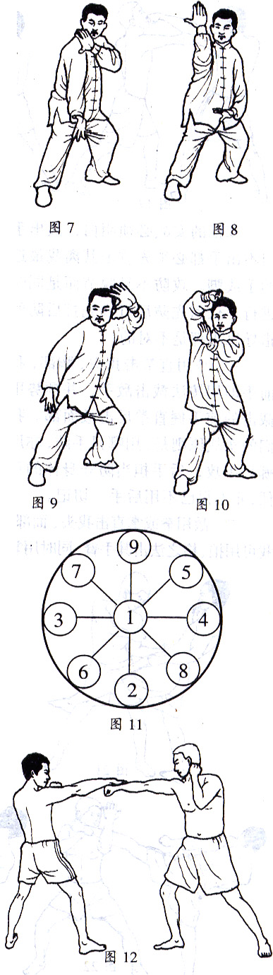 (1)先在墙上画一个高与眼平、低与裆齐的圆(图1),中间为一太极图,旁边为九个小圆,中间为(1),按图标好顺序。 (2)八卦手之按法练法:以右实战式站好(或内家三体式等皆可,图2),右手正对大圆中的太极图,在右拐步的同时,右掌往下按拍,(即图1中由①——②),同时发“嘿”声,到位后即刻弹起,右脚亦同时复原成原右实战式。按拍发力、发声、拐步须同时进行(图3)。防御范围由头到胸口一段范围,用于防御对手的直拳攻击。左右同时练至纯熟。 (3)八卦手之拍法练法:以右实战式站好,在右拐步的同时,右手由上向左向下拍击,同时喷气。拍击到位后即刻回复原位,即图1中由①——③(图4)。防御范围:只要敌攻击我右手左边头、颈部位时,可防守其直拳、栽拳、反背拳的进攻。左右练至纯熟。 (4)八卦手之格法练法:以右实战式站好。在右拐步的同时,右手握拳由左向右水平向外格,同时喷气,动作到位后即复原。防御范围:敌攻击我右边头、颈部时可防御其直拳、平拳。左右式练至纯熟。 (5)八卦手之挂法练法:右实战式(以下皆同),在拐步的同时右手握拳由下向上向外挂挡,拳与头顶齐即可,大小臂成一直角或小于90度。本技主要用于敌方用摆拳或鞭拳攻击我头部时。行拳路线为图①——⑤(见图6)。 练八卦手时为什么要配合喷气?因为实战中不能保证100%拦截成功,假如拦截失败,则可喷气发力用“绷劲”抗打,加上拐步的拧蹬旋转,使身无定位,敌方拳脚无法击中预定目标则攻击力大减,对我构不成威胁。 (6)八卦手之捋法练法:右手由上向下向后回捋至腰侧,同时拐步、喷气。本法用于敌方侧踹或正蹬我胸、腹时,我进步用捋法格开敌腿,获得打击的机会。路线①——⑥(见图7)。 (7)八卦手之抄法练法:本法即在捋法实施成功或直接由上向下再向上抄起。不论敌用何种腿法,只要是攻向我半身的腿法,都可以用抄接法,而一旦抄住,敌必仰跌无疑。现代散打的接腿摔即抄接法。路线由①——⑦(见图8)。 (8)八卦手之拨法练法:右手向左向下向右弧拨,同时拐步喷气。不论敌用何种腿法,只要超过我中线偏右侧时即可用拨法。实战中外拨并回勾令敌不能逃脱,我再实施反击。路线由①一一⑧(见图9)。 (9)八卦手之架法练法:右手由下向上翻转小臂架拦,动作定型时,小指向上,拳心向前。本法可防御敌由上向下攻击我头部的动作。路线由①——⑨(见图10)。 注:初学者只管练右手即可,不要顾左手。图中乃高老师的本能攻防动作,初学者勿模仿。 以上八手法,动作到位后必须复原成原式,准备下一次练习,养成“一发即收”的本能习惯。“任何绝招其实都是成千上万的反复练习而达到本能超觉反应”。八卦手不限场地和时间,随时随地皆可练习。练时面前无人当有人,用时面前有人当无人,意想敌用何种方法从何角度攻我,我则用何种方式破解,久练之,实战中敌刚出手我即能自然拦截并予以反击。每天练1—2小时以上。 第三步综合练法 仍按右实战式站好,按八卦手单练顺序:按、拍、格、挂、捋、抄、拨、架八种手法,不能停顿,一气呵成。练时充分活动手腕,并蛹动手指,使之节节贯串,久练之,可练出内家感应(即听劲)。能达到见手不能逃, 自然运用沾连绵随的太极功夫。练法:按图11循行路线练。全身放松,动作越慢越好,呼吸亦随动作缓慢随之即可。 反复练习至力乏为止。据经验,一次练习在60分钟以上,比分次练习2—3小时的效果还好。 第四步八卦手攻防实战 真正的实战必须明白,敌出手与不出手都必须先攻击其离我最近的手或脚。攻防不是脱节而是同时进行,任何先防后打或先打后防的指导思想都是不对的。 一、敌用直拳击我头、胸部,我前手即用按法截击敌手,并顺势用截击的前手握直拳反击敌面部。我们的实战原则是,用哪只手防,亦用哪只手攻,后手担当防守身体的重任,非不得已不用后手。切记。 二、敌用拳或掌直击我头、面部,我可用拍、格之法击其手臂,同时用掌削击敌颈或用直拳击敌面、鼻。 三、敌用摆拳击我头部,我用挂法挂开敌臂,同时用劈拳反击。