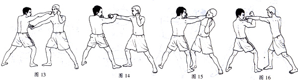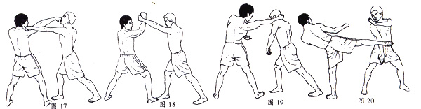 四、敌用鞭腿攻击我胁肋,我用捋法拦截,同时进身用撞拳击敌胸腹。 五、敌用正蹬或射踢击我胸腹,我用抄法令其倾跌,顺势跟进用虎扑法击敌于丈外。 六、敌用侧踹或鞭腿,我即用退步外拨敌小腿后,上步用摆拳击敌头部。