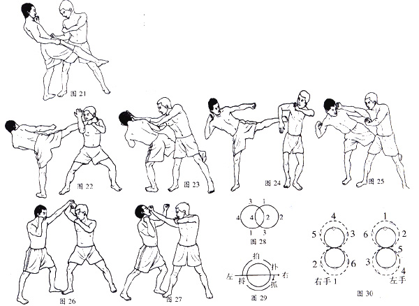 七、当敌用劈拳击打我头部时,我可用架法顺势用反背锤击敌面部。 以上只不过是简单略述防守与反击之方法,实战时不可拘泥,得机得势则可随心所欲,自由运用(见图12——27)。 附阴阳手练法 一、左右阴阳手:在墙上画两个高与眉齐,低与实裆平,略宽于肩的圆,人站在两圆之间,两手一上一下,一左一右,右画圆(见图28)。左右手各放在④处。练时肘部绝不能,外翘,只能向下,练30—60分钟,力尽为止。 二、前后阴阳手:左右手一前一后同画一个圆,左手向前按拍,右手向后捋抓,右手按扑,左手抓捋(如图29),勿间断练习。