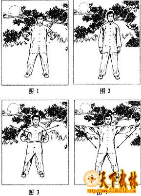 两腿稍直,成为开步直立,两手掌自然下垂于体两侧,指尖均向下,目视正前方(图2)。