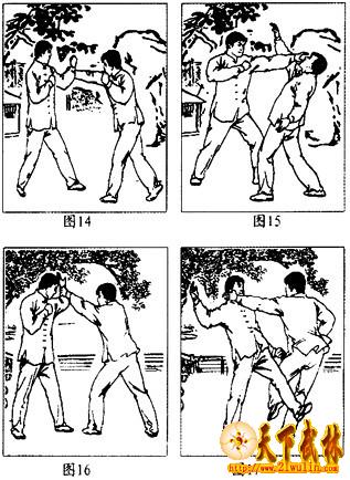 当对方前上左腿一步,同时用右直拳向我胸部击打时;我左脚在前,同时用左臂向左横向外拨挡开对方来拳(图14)。接着,我用右掌向对方面推击,使对方面部受伤(图15)
