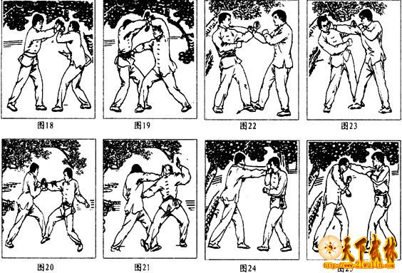 当对方前上左脚一步,同时用双掌向我面部抓来时;我左脚前上步,同时用左手臂向上架挡开对方来掌(图18)。接着,我右脚前上一步,于对方裆前,同时用右掌向对方右肋部横掌斩击,使对方右肋受伤(图19)。