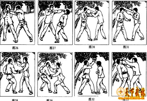 当对方前上右脚,并用直拳向我胸部击打时;我右脚右后偏身躲闪,并用两臂向右后横向格挡开对方右拳(图26)。接着,我身体左转,同时用左直拳击打对方面部,使对方面部受伤(图27)。