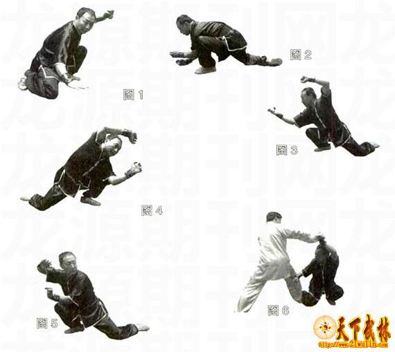 狗拳中盘招式之所以多用单蝙蝠步和单跪步,一方面便于实施中盘攻防,另一方面也为转换下盘做过渡。如果说下盘擒拿是狗拳最出彩的部分,那么狗拳中盘起到了“点晴”的作用。有了中盘才使狗拳“活”了起来,变化万端,妙不可言。除了以上“鲤鱼翻身摆尾”变招外,还可以转化成“狗咬棕”(图9)等等,不再一一例举,读者可仔细揣摩。