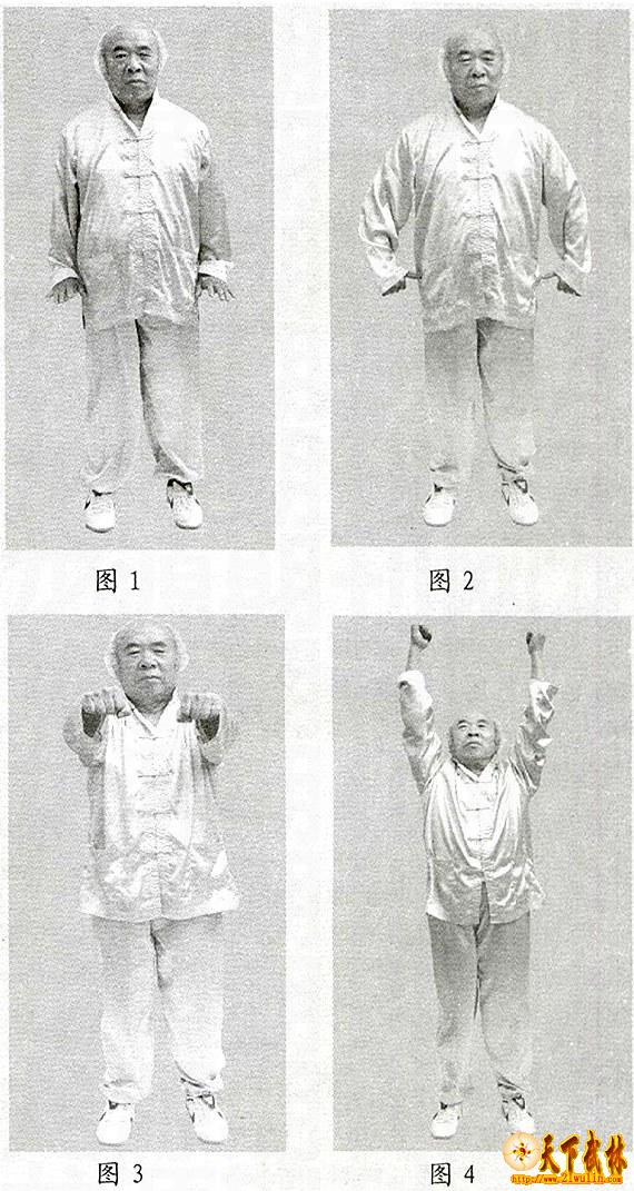 | 岳武穆侯居乡懿行立朝大节,昭然史册,然其调气而至于神勇,人罕见其法。有华山老人秘授调气炼丹图,凡二十四式。行此功者,须于静室面向东立,以收生气;舌抵上腭,调其气息,任其出入。通身不可一处用力,无有一处用力则气贯于手拳矣。每行一式默数四十九字毕,即接下式,不可间断,断则气散矣。数一字唯思手拳用力,行至第一套第十二式,半月后,方可全行,迟者至二十五日方可全行,须戒房帏,三十五日后方行顶上之力,百日成功,每日昼夜须吃五顿饭,百日后,软弱者可举百斤,强者力举千斤,更能保元气,益寿延年。 炼气要诀 元气清温浊气凉,神仙留下健身方; 必须开裆收下气,站立又要膝盖藏; 滚肩束胁攒脑颈,开胯下腰最为良; 汞从口入非自口,却从嘴角入小肠; 气出鼻出不是出,鼻送五脏入膀胱; 入气之时不及力,出气之时贵身强; 更有口诀真妙法,似闭不闭张不张。 第一套 第一式:面向东立,首微仰,目微向上视;两足与肩宽窄相齐,脚站平不可前后参差;两肩垂下,肘微曲;两掌朝下,十指朝前,默数七七四十九字。十指尖想往上翘,两掌想往下按。数四十九字即四十九翘与按也(四十九字即一、二、三、四、五……数到四十九)。(图1)