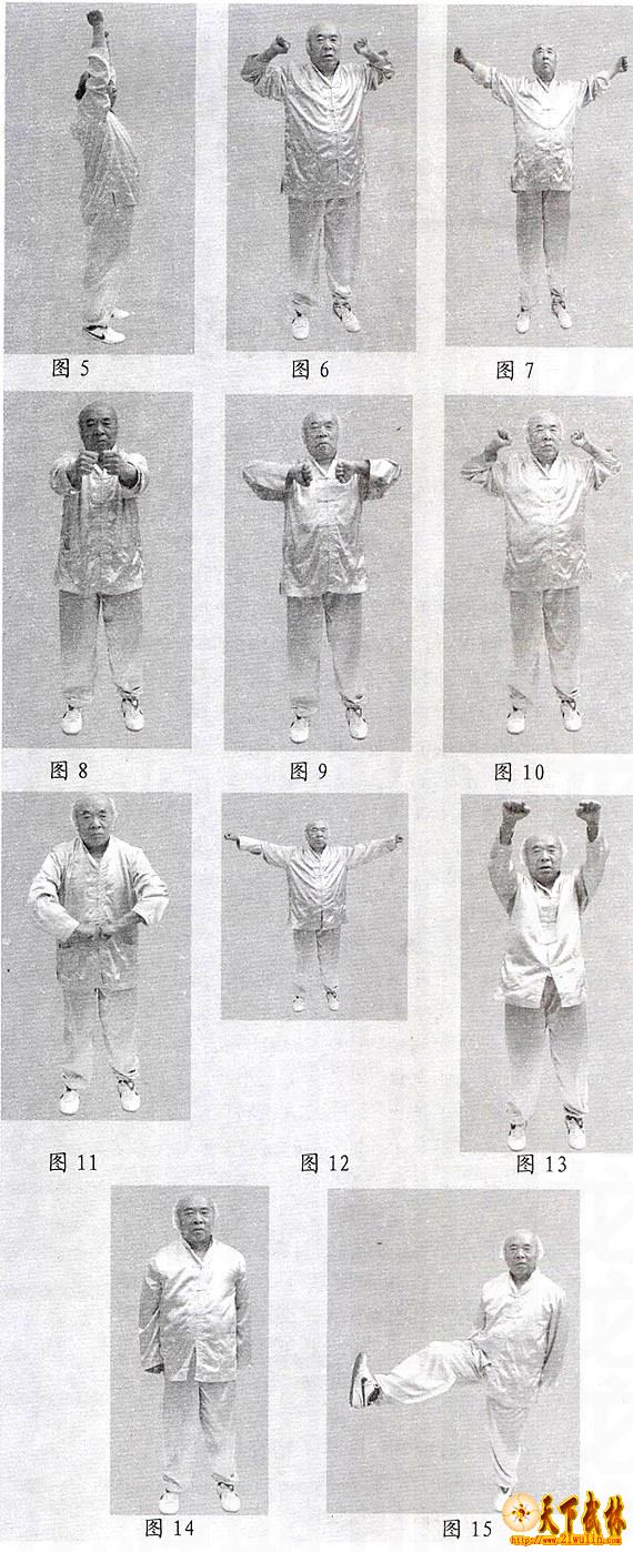 第二式:前式数字毕,即将八指叠为拳,手背朝前,两大指朝身,两肘微曲,每数一字拳加一紧,大指一翘,数四十九字,即四十九紧,四十九翘。(图2) 第三式:前式毕,将大指叠在中指中节为拳,趁机往下拧一拧,肘之微曲至此伸矣,虎口朝前,每数一字拳加一紧。 第四式:前式毕,将两臂平抬起,伸向前,拳拳相离尺余,拳与肩平,肘微曲,数四十九字,拳加四十九紧。(图3) 第五式:前式毕,将两臂直竖起,两拳相对,虎口朝后,头向后仰,两臂夹头,不可贴近,亦不可外远,数四十九字,拳加四十九紧。(图4)(图5) 第六式:前式毕,将两拳下对两耳,离耳寸许,肘与肩平,虎口朝肩,拳心朝前,每数字,肘尖想往后用力,拳加一紧。(图6) 第七式:前式毕,全身往后仰,以脚尖离地为度,趁仰势即将两臂伸直,与肩平,虎口朝上,每数一字想两拳往上往后用力,胸微向前,每数一字,拳加一紧。(图7) 第八式:前式毕,两臂手转向前与第四式同,但此两拳略近些,每数一字拳加一紧。(图8) 第九式:前式毕,将两拳收回,向胸前两乳之上,拳向上翻,拳心向外,两大拇指节距鼻尖一二分,头往后仰,每数一字,拳加一紧。(图9) 第十式:前式毕,将两拳分开,肘与肩平,肘尖向后用力,两拳直竖起来,拳心向前,拳眼(虎口部位)遥对两耳,想往上举,两肘想往后用力,每数一字,拳加一紧。(图10) 第十一式:前式毕,将两拳翻转下至肚脐,将两大拇指、食指与脐相距一二分,默数四十九字,拳四十九紧,四十九字毕,含气一口,随津液下咽至丹田。如此吞气三口三咽。(图11) 第十二式:吞气三口不用数字,两拳松开,两手垂下,手心向前,双手上端与肩平,脚跟微起,以助两手上端之力,如此三端,俱如手端重物之用力也,两手握拳,抬起过头,用力甩下,三举三甩,再收两足轮换抬起前蹬,先左后右,各三蹬,仍向东静坐片刻,以养其气。如即行第二套,吞气后可直接行功,不必甩手蹬足。(图12)(图13)(图14)(图15)(待续)
