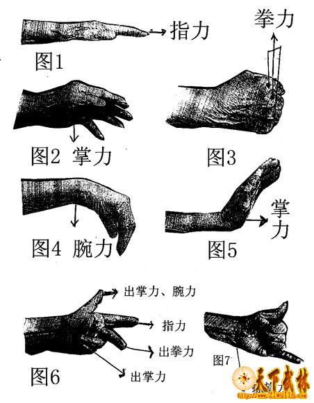 这只是我的解释,并非太极名家的高深解释。图6之手型,即为卍字手型。手型中: 食指——指力;大拇指——腕力及掌力;弯曲的中指——拳力;大指与小指——螺旋力(见图7)。