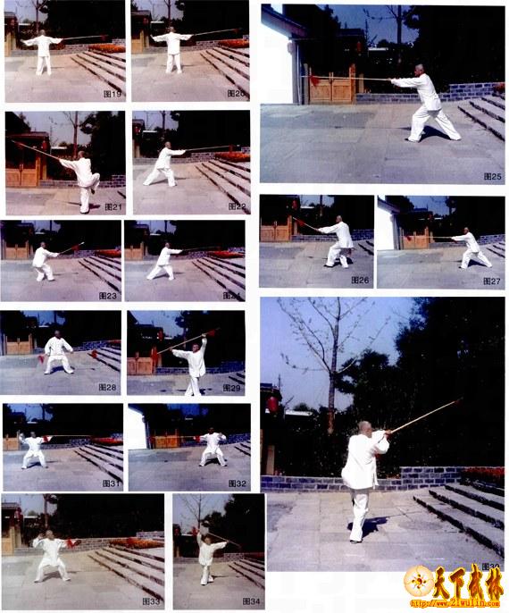 19、开步单手扎枪 接上式,动作不停,左脚向右脚前上步,向右转体180度,两腿开立成撑裆,同时右手单手提枪顺向右转身之势向下向右平扎去,左臂向左平撑成立掌,枪身平行地面与两臂成一条直线,眼向右看。(图19) 20、左转立元右单手扎枪 右手单提向上使枪倒立,手心向右,虎口向下翘腕,使枪在身背后向左上扬昂头,左手在左胯后抓枪上提向左向上打一立元,同时右脚向左脚前上步,向左转体180度,此时左手手心向上,虎口向左,在面前将枪倒提,右手在身前下头抓枪。动作不停,左脚向后退步再向左转体180度,两腿开立成撑裆,同时两臂向左右撑开,左手成立掌,右手单手提枪向右平扎,枪身与两臂成一直线,眼向右看。(图20) 注意:本式与上式定式姿势虽然相同,但来势却不一样,上式是由背上穿花,上左步向右转体180度后右手单手向右平扎枪。而本式是由右手单扎枪,背后换左手,转身打花向左转体360度,再交右手单手扎枪。 21、左独立倒插 身向右转,左脚向前上步,同时在手手心向上,向前接握枪的中段一棒,向上向右一掀,换握在右把下,右手微松滑握在左手处,同时右脚向前盖跳步出左步,左手上提虎口向下,顺势向左转体180度,左腿独立,右腿屈膝上提,脚尖向下,右手将枪由右下向左上撒手一送,左手微松滑把接握在右手把处,单手提枪,眼向左看。(图21)