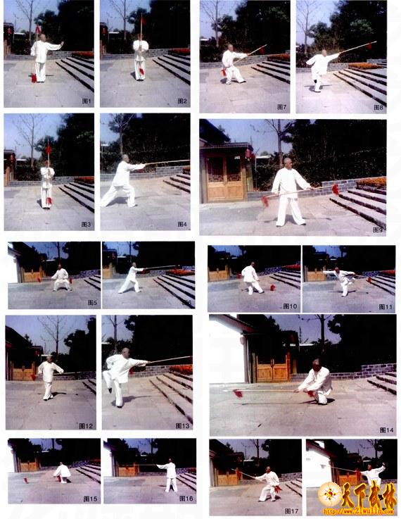 5、退左步右穿梳 左手向里一翻手心向上,左手枪头向左回带,身向左转两腿屈膝成马裆,枪身横于胸前平肩,动作不停,右手将枪向左一送,撒手平穿,左手微松滑把接握在右手把处,左脚向后退步快速向左转体180度,两腿屈膝成马裆,左手将枪向左回带同时右手向前接把,抓握在左手把处,两手将枪横于腹前,眼向前看。(图5) 动作要领:右手向左穿枪动作要快,枪身平肩且与地面平行,左退步转身要与右手向前接枪动作同时完成。 6、左弓步前刺 两脚原地向左转体90。成左弓步,同时两手将枪向前平刺,左手微松,右手将枪向左手后一送,向前穿刺,两手相靠,两手虎口向后,手心向下,眼向前看。(图6) 7、左虚步抱枪 左手微松,右手将枪向下向后回抽,拉向右胯旁,左手顺势屈肘将枪上抱在胸前,同时重心后移,右腿屈膝半蹲,左脚稍后退,左腿微屈,脚尖点地成左虚步,眼向前看。(图7) 8、左前过顶左独立背后穿花 两手将枪向上捧起,左手高右手低,左手顺势将枪身由前过顶,斜放在后背上,动作不停,右手将枪在身背后由下向上向左手后用力撒手一送,左手微松滑把抓握在右手把处,同时右腿上提,左腿独立,身体稍向前俯,眼向前看。(图8) 9、左后过顶退右脚左穿梳 右脚向左腿后插步落地,向右后转体180度,同时左手上举在头顶之上,虎口向下,枪身倒垂在身后,右手顺势虎口向下反手在右胯处抓枪,随向右转身之势,左手由后将枪向前过顶向左侧绕下,右手屈肘向怀内翻腕,手心转向上,将枪翻转托起,动作不停,左手撒手将枪平肩向右一送穿刺,右手滑把抓握在左手把处,右脚迅速向后退步,两腿微屈成马裆,同时左手向前接把抓握在右手把处,两手将枪横于腹前,眼向前看。(图9) 10、右虚步盖枪 紧接上式动作不停,左脚再向后退步,左腿屈膝半蹲,右腿微屈稍内收脚尖点地成右虚步,同时右手将枪由右后向上向前磕去盖打,左手向下向左向后将枪拉向左胯旁,枪身稍向前倾,右手枪头略低于右膝,眼向前看。(图10) 注:本式与前式要动作连贯,中间不要停顿,速度要快,桩步要稳。 11、左独立燕子扑水 两脚原地向左后磨转,转体180度,重心右移,右腿屈膝半蹲,左腿微屈,脚尖虚点地面成左虚步,同时右手将枪向下向左腋后向上一送,松手离把向前平举成立掌,左手单手将枪背向左臂后,重心随即左移,右腿在后离地悬起,膝部微屈,脚心向上,左腿微屈独立,上体随之前俯,枪身斜背在左臂后,眼向左后看。(图11) 12、左绞丝步左右提换横腰枪 身体向上直起,右脚向左腿前盖步落地,顺势向左后转体180度。两腿开立成撑裆,同时左手屈肘枪向身前上提,虎口向下,枪身直立,右手随即虎口向下,手心向外在身前左手下抓握枪身,左手松开,右手稍向上提,将枪绕向身后横靠在背后腰脊上。同时两脚原地再向左后磨转,转体180度成左前右后之绞丝步,两腿微屈,左手顺势在左胯旁抓接枪把,两手手心向前,虎口向外,眼向左看。(图12) 注:本式两脚均踏在场地中轴线上(正门下头中段处),面南背北,两手枪头横指东西。 13、右插步摇橹背穿 紧接上式左脚向左开步,右脚随即向左腿后插步,左脚再向左开步,右脚再向左腿后插步,如此开步插步连续向左横走三步,同时枪身紧靠后腰,两手将两侧枪头配合向左横走,同时各划三个小圆圈,当走到左脚向前时,右腿屈膝上提,脚尖向下,左腿挺直独立,同时右手将枪由右沿后腰向左撒手用力一送,左手微松滑把抓握在右手把处,眼向左看。(图13) 14、右绞丝步地蛇枪倒插 右脚向左腿后插步落地,两腿左前右后交叉站立,同时左手将枪向上一拎倒提,枪身直立,(左手虎口向下手心向外)右手在身下腹前,虎口向下,手心向外,抓握枪身,动作不停,原地转体360度成右前左后之绞丝步,两腿交叉屈膝下蹲,同时两手握枪随身右转向下向右平插,右手微松,左手握枪向右手后穿靠,枪身与地面平行,两手相靠,在右膝外侧,离地面约五、六寸许,两手虎口均向右,左手心向下,右手心向上,眼向右看。(图14) 动作要求:左手上提,右手下抓枪的动作要与插步同时进行。原地转体下蹲动作要快要稳,向右插枪动作要迅速,同时完成。 15、右并步地蛇枪 左手将枪向左一拉,撒手,体左转180度成开步立着,左手此时在右手下面抓枪,右手向上向右拉枪,枪身横于腹前,动作不停,右脚向左脚并步蹲下,右手将枪向左手一送,左手微松,两手相靠,向左平穿,枪身与地面平行,离地约五、六寸许,两手虎口均向右,左手心向下,右手心向上,眼向左看。(图15) 动作要求:左手换把,右手滑动动作要迅速自然,并步下蹲要与向左穿枪动作同时完成。 16、右开步穿梳 身体向上起立,右脚向右横开一步,左手微松,右手将枪向右一拉,两手将枪捧住,此时两手虎口向右,向上刺去,动作不停,体微左转,右手撒手将枪向左手一送,左手微松滑把抓握在右手把处,眼向左看。(图16) 17、右虚步抱枪 紧接上式身向左转,右脚快速向前上步,重心后坐,左腿屈膝半蹲,右腿微屈,脚尖点地成右虚步,同时右手向前屈肘接枪,抱于胸前,左手向下将枪 拉向左胯旁,右手手心向上,左手手心向下,眼向前看。(图17) 注:本式与前式穿梳动作要连贯起来,上下配合要协调,速度要快。 18、右前过顶背上穿花 右手将枪身由前托起向后过顶,放于背后腰上一点,左手顺势将枪在背后向上向右处撒手一送,右手微松滑把接握在左手把处。同时左脚用力蹬地而起,左腿屈膝悬空,左脚尖向下,右腿挺直独立,身稍前倾,眼向前看