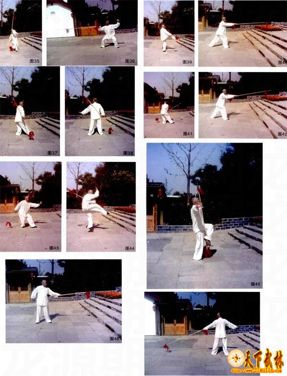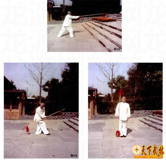 身微左转,右手顺势将枪带至身前,向上先向右,后向左在两侧打勾挂花,打到右手在右虎口向下时,手心一翻向上,随即右腿向上屈膝提起右手将枪由后向裆下,向裆前一送,穿裆前刺,左手在裆前抓枪顺势向前将枪抽出,右手松手离把,眼向前看。(图39) 说明;(1)勾挂花是枪棍类等器械常用之手法,操作时,无论左右哪手单提,均是以手握枪之中节,用枪之下头先开始动作,具体方法是运用握枪之手的手腕先向外向上,后向内向上不停地翻转,使枪之下头带动整个枪体来完成身体两侧的绕花划园动作。打花时对侧之手应作相对运动,且提枪之手要略高于胸部,勾挂花亦称反手花。 (2)所谓枪之下头是指握枪之手手后一端之枪头,握枪之手手前一端(即虎口前侧)之枪头称之为枪之前头。 (3)就本式而言,是以右手握枪单提,以枪之下头先向右向上向右后向下向前绕转,再以枪之下头向左向上向左后向下向前绕转,在两侧划园绕花,当枪向右向上绕花时两臂张开,两手手心向外,当枪向左向上绕花时两臂胸前合抱(左臂在内)两手手心向内。形成一开一合之势,枪在两侧绕花最后趁右手在右虎口向下时,右手向上向右翻腕手心转向上趁势将枪之下头由后经裆下向前送去,同时右腿微屈高举,左手在前抽枪,右手松开离把。 40、右弓步前刺 右脚向前落步身微右转,面向东。右腿屈膝半蹲,左腿在后挺直成右弓步,同时右手在左手前手心向上接枪微向上捧起枪身,手微松左手握枪随向前弓步之势,将枪向右手后送去,向前穿刺,两手相靠,两臂伸直,高与胸平,眼向前看。(图40) 41、右虚步左后下插 左手向下向左胯旁拉枪,右手抓握枪身向下向左手一按向左后插刺,同时体重后移,左腿屈膝半蹲,右脚稍后移脚尖点地,右腿微屈成右虚步,眼向前看。(图41) 动作要求:左手向下向左胯处拉枪时,右弓步未动,右手向左后下插刺枪时,重心方后移,下刺动作应与右虚步同时完成。 42、右弓步前刺 右脚向前出半步,重心前移成右弓步,同时右手将枪向前抽拉,微向上捧起枪身,手微松,左手握枪随向前弓步之势将枪向前向右手后一送,向前穿刺,两手相靠,两臂伸直,高与胸平,眼向前看。(图42) 43、右虚步右后下插 左手向下向右胯旁拉枪,右手抓紧枪身向下向左手一按,向右后插刺,同时体重后移,左腿屈膝半蹲,右脚稍向后移脚尖点地,右腿微屈成右虚步,眼向前看。(图43) 动作要领:同前41式,唯左右后下插枪有别。 44、右弓步前刺 右脚向前出半步,重心前移成右弓步,同时右手将枪向前抽拉,微向上捧起枪身,手微松,左手握枪随向前弓步之势,将枪向前向右手后一送,向前穿刺,两手相靠,两臂伸直,高与胸平,眼向前看。(图44) 说明:从40式至本式五个动作,共有三个右弓步前刺,两个右虚步后插,均是在面向正门下头(正东),左脚原地不动,全凭右脚前后移动,两腿互变重心的情况下来完成的。要求前刺后插重心变换时,动作要连贯,上下要协调,要有节奏,阶段分明,穿刺迅速,把活身灵,切忌动作前后脱节,生硬呆板。 45、右磨盘古树盘根 两手相靠将枪之前头由前向下向右划弧落下,两手顺势向下向右向上翻转,两臂屈肘将枪绕至身后,上举于脑后上方,两手虎口均向下,枪身在身背后垂直于地面,动作不停,迅速向前上左步退右步,向右转体180度,两腿开立微屈,枪身在背后上举随身右转,右手松开,左手单提使枪由后向左绕向身前,继续向下向后再向左在身下绕一大园圈,同时身向前俯下,右左两脚先后跳起,让枪身在两脚下绕过,两脚先后落地后身体直立,两腿仍成开裆站立,右手松开离把后,自然垂落于身体右侧,眼向左看。(图45) 动作要求:两手将枪向身后绕转要与向前进步转身动作同时进行,枪身下绕时身体顺势前俯,动作要快,两脚跳起时要灵活,上下协调,不要有停滞现象。
