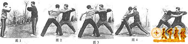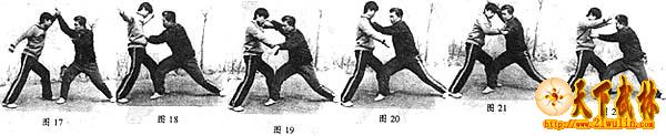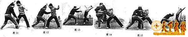 本组重在手法上的变化,甲乙双方手法上的变化,似粘又不是粘,似是而非,连绵不断。该断则断,慢了就断,打上就断。如双切脖与双撞捶,都是断手。简而言之,谁慢谁吃亏。如第二动甲方双塌,乙方分掌以后不往外挂,反拳向上即可撩击甲方下颏。关键在于速度和力度。