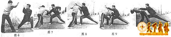 本组技法重点在手法上的变化与身法的密切配合,身法重在腰功。画面上体现的是左右两个切脖掌,但画外之技却丰富多彩。如第三动甲方的右切脖掌,只要右手前伸,腕部内旋,向下抹捋,同时将其左臂向身后反撅,就会变成抹脖切,使乙方身体向前下方跌出。总的技法要有机则变,变则活。
