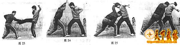 甲右乙左,甲方抬右腿,用右脚撩踢乙方裆部,左手在头部左侧上方,右拳在体右侧,目视撩阴腿。乙方向前上右步,同时用右拳劈砸甲方撩阴腿小腿部位,目视劈砸手。左手握拳在左肋间,拳心朝上(图23)。