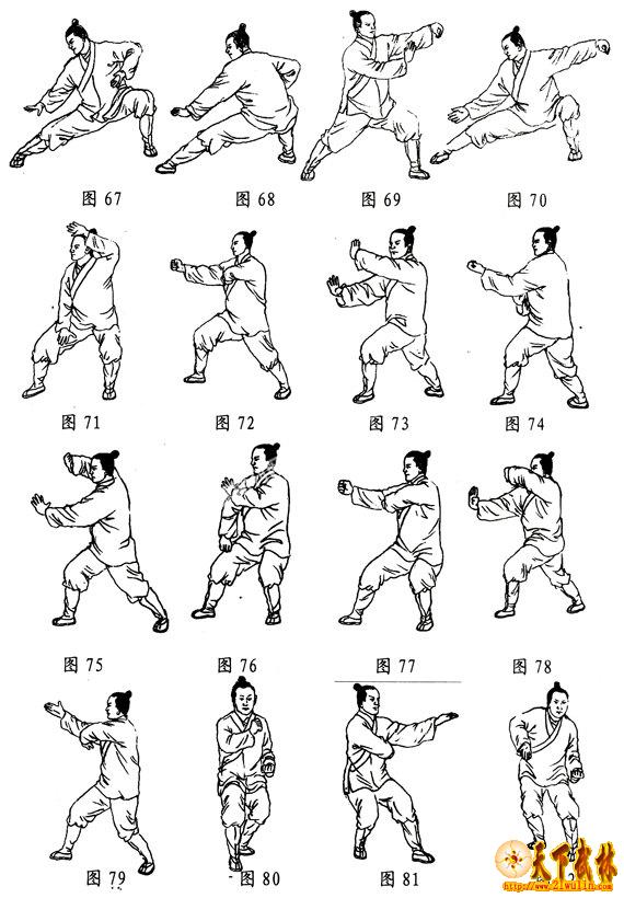 5、上体左转,上右腿成弓步,右前臂向前上方架起,掌心朝前,左拳变掌向下、向后,再向前推出,与胸同高,眼看左掌,面向西北。(图75)