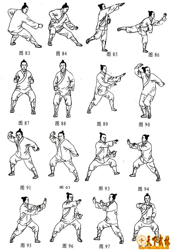 上体向前挺起,左腿伸直独立,右腿提膝,膝面竖直,右小腿背起;左拳上提抱于胸前,右拳变一指,手背向上,高与肩平,向前插出,眼看二指尖。(图85)