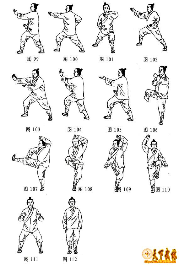 上体左转,右腿上前半步,左腿成前弓步,两手按于胸前,成抱球状,左手在上,右手在下,眼看左手背。(图101)
