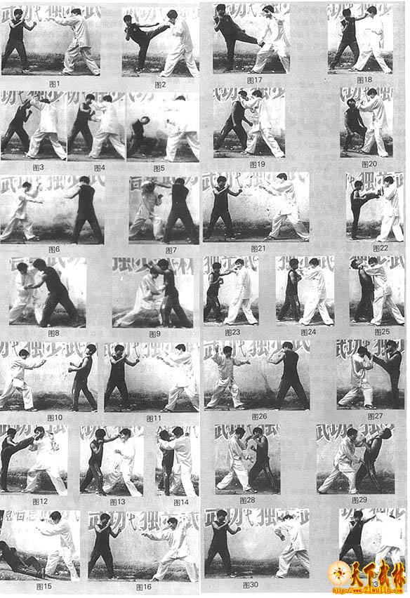 此拳是敌起腿,我防带敌腿,使敌腿落于我恰到位置或敌出拳攻击,我同时上步以我脚关敌脚,随之我双掌由左向右或由右向左拦排敌中上盘,使敌仰跌于地,注意一定要控制敌方才能使用。