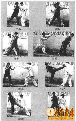 例如:我以鸡形桩与敌对阵时(图36),若敌以左踹腿击我中盘要害,我则左手挂勾(图37),呈上式,我粘住敌腿,并上步敌侧(图38),呈上式使敌腿落于我恰到处,同时我脚关住敌后脚根,双手变掌(图39),随势横排敌颈或中盘要害,要有横扫千斤之气势(图40)。