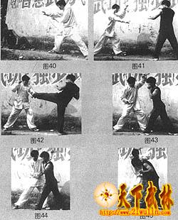 例如:我以伏虎桩与敌对阵时(图41),若敌以左鞭腿击中盘要害,我则以左手闪格压(图42),若敌再以右拳盖劈我头部,我则架化敌拳(图43),随上式我外压敌拳,同时移步进身,双手变拳,对准敌耳门和心窝(图44)。随上式,以雷电相触之速之威,击打敌之耳门和心窝等上中盘要穴(图45)。