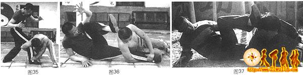 例八:如敌人对我实施别腿滚摔时(图35),我则主动坐倒于地,化去敌人之势(图36),顺势用另一腿之脚后跟蹬击敌人后脑(图37)。
