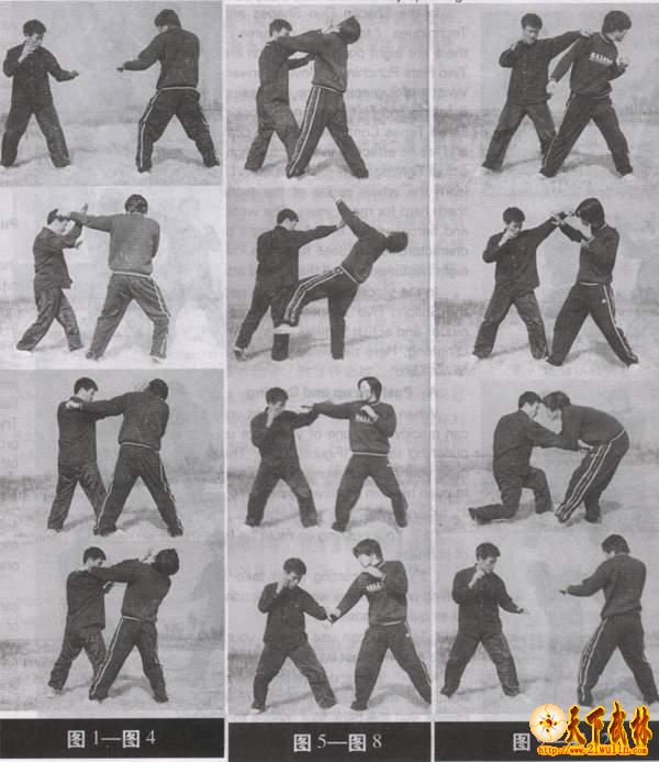 (1) Your judge of his fist attacking must be exact. Your avoiding, pushing and punching should be finished at the same time. Then, the followed two times of punching must be one by one closely, just like a blow of wind.