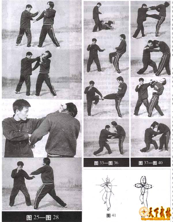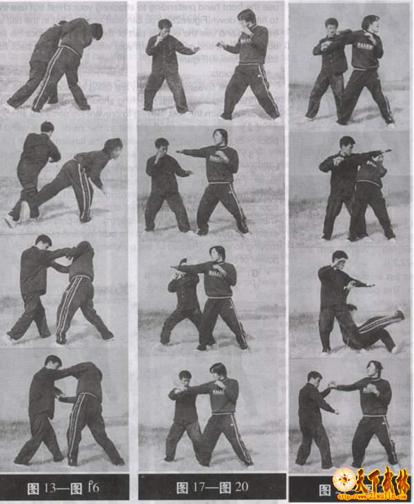 (3) The skills can also be used to deal with hooking fist, swing fist and arm hitting. You can look at the Figure 15 and 16 to learn the ways of using them. That‘s needn‘t describe more in details[Figures15,16].