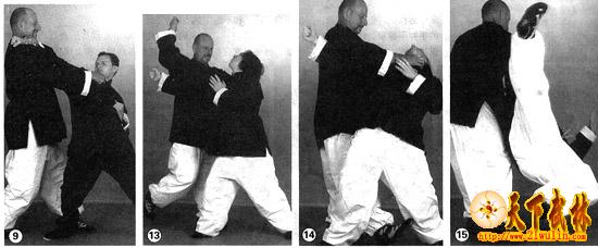 采取中立的准备姿势来引诱对方向前(图11),当对方用爪攻击时,这时,功夫练习者用螳螂臂使对方肢体陷入困境并且用他的左前臂拳击对方肘部(图12)。然后,格斗者抓住对手一撮头发将对方的头向后拉,这样将其对手的喉部暴露出来(图13)。最后,使用猴子摘桃的技术压住对方气管(图14),并且将其快速摔倒在地(图15)。