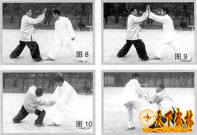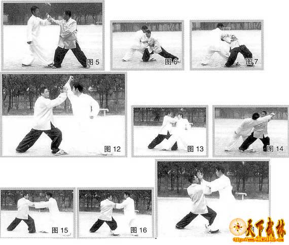 要点:托肘与采腕、下按同时进行,转体要快,用螺旋整力,拉腕、推时、撞腿同时进行,形成合力将甲方仰面送出。