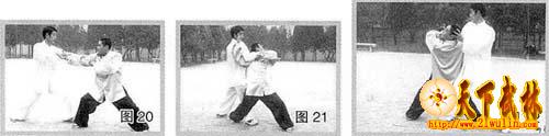 动作说明:1.乙方出右拳或掌直打,甲方左手采其腕,右手按乙方肘部(图20)。