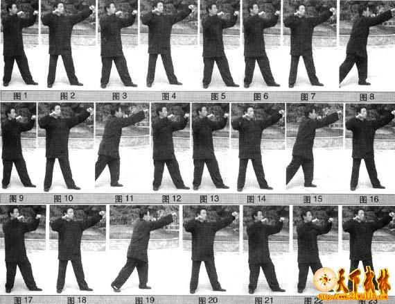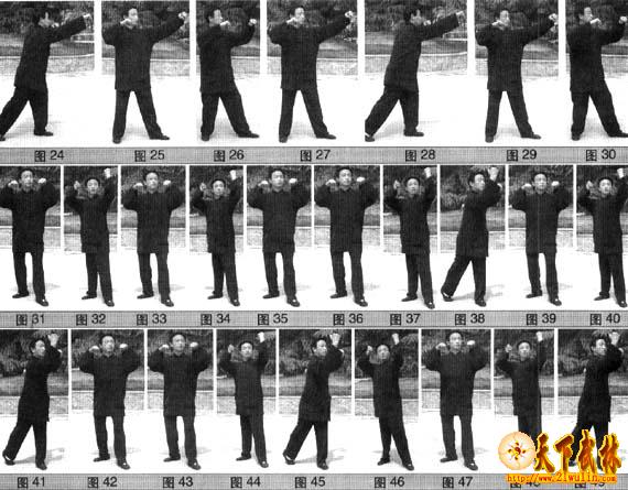 站立的步法、手形与不直的直拳起式相同。走第一步左钻拳的发力与走一步左钻拳发力相同;发力后,右钻拳的发力与定步右钻拳相同;第三拳左钻拳的发力与定步左钻拳第三拳的发力相同,一发即止。手形、身体重心仍回到前三后七起式。右式走一步三钻拳发力与左式走一步三钻拳发力,动作要领、意念要求相同(见图43-51)。