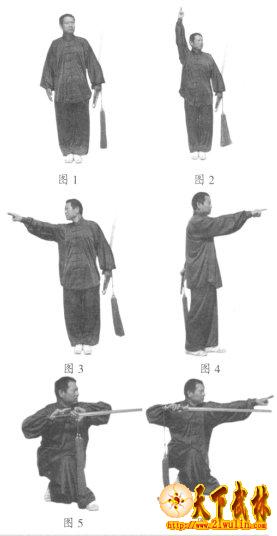 1、仙人指路:右手变剑指,由下向上举,剑指向上,目视左方(图2)。然后,右剑指下落至肩部后向右指出(图3)。身体左转,右剑指再向前指出,目视剑指(图4)。