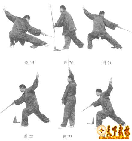 14、弓步后削:身体直起,左脚向右脚后插步,右手持剑收于腹前,剑尖朝上,左手剑指附于右手腕(图20)。右脚向右侧跨一步,左腿屈膝呈弓步的同时,右手持剑削向右后下方(连续做两次)。面向北,目视剑尖(图21)。