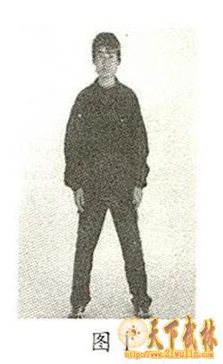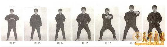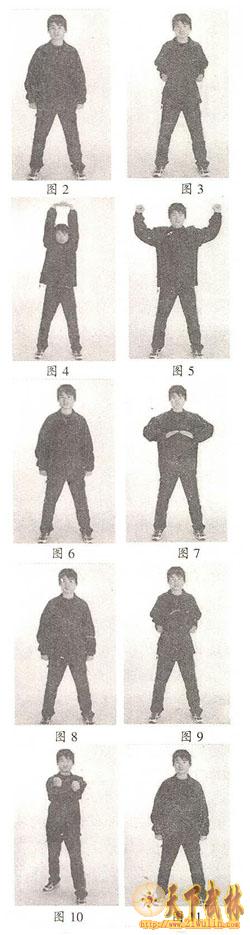 预备式:两脚打开,与肩同宽,两手自然垂于体侧,头顶正直,平肩顺气,舌贴上腭,自然呼吸,意守丹田,目光内敛,精神内固,要求站立3-5分钟。口诀:双脚开立,与肩等宽,舌触上腭,神定气闲,虚心实腹,目光内敛,精神内固,道相庄严。