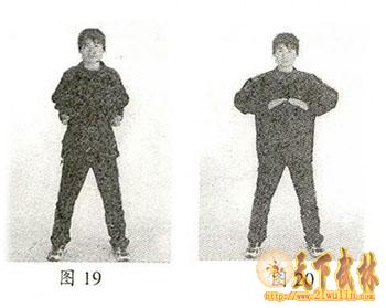 第三式:金鹏挺翅。承预备式,鼻孔吸气,意念将气注入丹田的同时,两手成导引拳,抬两臂向内屈臂,高与肩平,使两拇指端对肩窝,拳心向下,拳眼向内,一边吸气,一边将两拳沿体前左右二脉向下导引,至与丹田平齐后,向内与丹田合拢,全身适当用力,松紧适度,气沉丹田,至气吸满时,闭气;同时,两手屈拇指用劲握拳,使拳坚固,吞气一口,两拳用劲上提,使两拳抱于腰间,两腿同时屈膝下蹲成马步,两拳体前十指交叉,翻掌。两掌前推,掌心向外,掌背朝内,高与肩平,翻掌,使掌心向内,掌背朝外,两掌十指交叉不变,适当用力,轻叩心口1次,两掌分开,抱于腰际,左掌前推,用力抓握回收,前臂轻击左肋,右掌前推,用力抓握回收,前臂轻击右肋,两手互换,重复以上动作8-24次,将两手提至胸前心口部位,两掌指尖相对,掌心朝下,用鼻孔呼气;同时,将两掌下压推至丹田,分掌至体侧,同预备式。(如图13-20)