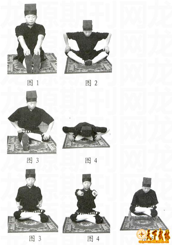 1、正坐于练功垫上,两腿伸直,双手抓住脚尖,上体前曲,并向前向下做压振动作(图1)。