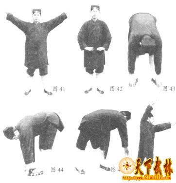 (2)接上动,腰部放松,身体自然向前向下前屈弯腰,双臂完全放松随身体前屈,双掌尽量触地,同时闭口,用鼻孔短促喷气(图43、44)。