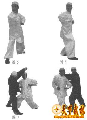 承上势,移动重心向前,左脚向前上一步,左手从上朝前领出,随即上右脚过左脚,朝前踩出,以身带步,以身催右肘朝后斜方抖出,如磨转螺一般,追上右脚一步,双手从胸前如撕争开,步呈前膝弯套后膝弯的鸡步或四平马步、弓步,三尖照,六合合,目前视。左手可上领下撩,以身带右脚上步的同时,以身催右肘向后瞬间抖出。两肘如石磨在迅速地转螺,有如洪水决堤,猛然直飞向前。在实战中有圆中求直,三角发力,直线最近的打法,击敌于闪电不及合眸,打人如同雷发且不及掩耳。(如图5、6)