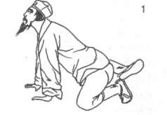 擦热丹田和两肾,四肢如蟾蜍状跪膝俯撑于坡形地面。吸气屈肢收缩,身体下俯并将小腹内收,缩唇吹气时意守丹田,头部上扬并伴发口哨音,同时四肢缓缓撑直,小腹腰背紧凸。共练习30次(图1)。