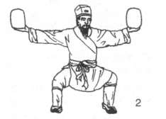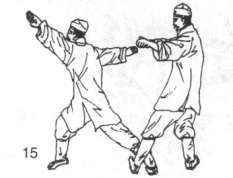 弓步桩下坠,两臂伸展。老师用推、拉、挤、顶、拖、抱、勾、扫、打、撞、抖、压十二字诀撼动练功者。练功者似身化钟座(喻人为金钟,以头为钟首,以肩为钟肩,以膝胯为钟底裙边。实指人体向下用坠劲时,要上聚下阔,劲往外下方支开下坠)坠入地,劲往钟底裙方向撑展,以御化六方来力(图15)。