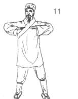 两腿与肩同宽跨立,吸气时两手由前捞起,抬至眉高时服气并握拳、收肛、抓趾。呼气时松开,两手随之下按,意念纳气充腾小腹。每服气一口,意感身体似加重50斤,使双腿脚下沉一分(图11)。