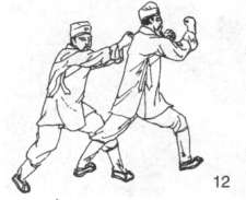 由老师用手掌按揉练功者周身,揉于何处意识随行何处,接着以高弓步桩闭目承打。事前双方要说明,由老师专门击胸部各区域,然后依次击打上腹、下腹、腋肋、背腰、头部的各个区域。要求承打时瞬间用鼻呼气发“哼”音,闭目感受来力部位并抵抗打击。一月后,闭目由老9币任意择打不同部位,并逐渐加重打击(图12)。