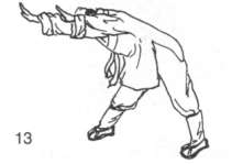 两脚屈膝跨立,吸气时周身前俯并向下蹲缩,喷气时伸展腰腿,双臂向前上方抖出,务使气布周身,体腔活散,形完劲整,上下协调(图13)。