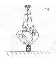 头顶倒立,双手叉腰吸气喷气:第一息,意守百会穴;第二息,意在喉颈;第三息,意充对心穴与心窝穴;第四息,扩双气门;第五息,意满箍腰带;第六息,意聚丹田;第七息,气满海底。然后坐下,一掌按百会,一手托肾瓤,调息两分钟,意守肚脐眼,整套重复练习数次后引意归元(图14)。