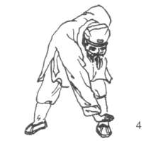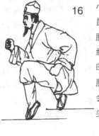配戴绑腿沙衣,两手叉腰,低桩矮步进退盘行于沙坑,务使身正桩沉、气力下注。时而沉气小腹,意注昆仑穴,用脚平掌坠地缓绕圈步:时又托气于胸,意聚百会穴,以脚尖点地矮步轻行至疲劳为止(图16)。