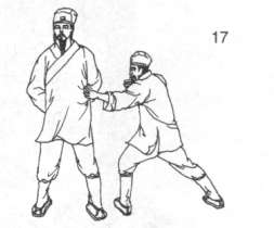 按上部功第十把的意念行气十遍,再由老师用手任意推搡身体各部位,练功者则摆躯柔化并用内气如塞棉般柔和冲聚相应部位,以消抵来力。完功后,简单压开各关节韧带,一边行走、一边调息而毕(图17)。