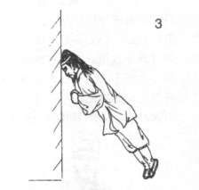 头顶前部抵墙,双腿远离墙并立,腿脚后筋紧拔与身体保持一线伸直。吸气微屈膝,意念丹田,屈肘夹臂,双拳护心。喷气两拳沿体侧下冲,双膝伸直,意守百会穴和双昆仑穴,同时咬牙鼓颈,头部加力滚顶墙面,共练习50次(图3)。